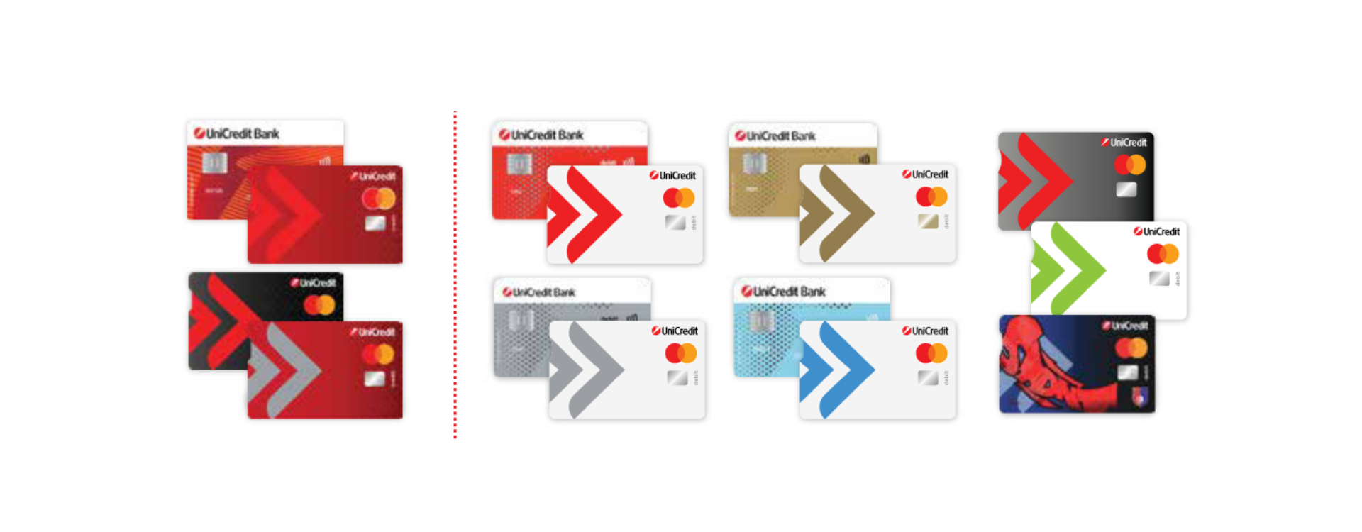 * Mastercard Classic, Revolving, Business, Debit Matercard, MasterCard Dopunjiva, Matercard Internationa, Mastercard Zlatna, Mastercard Student, Mastercard Business Debit